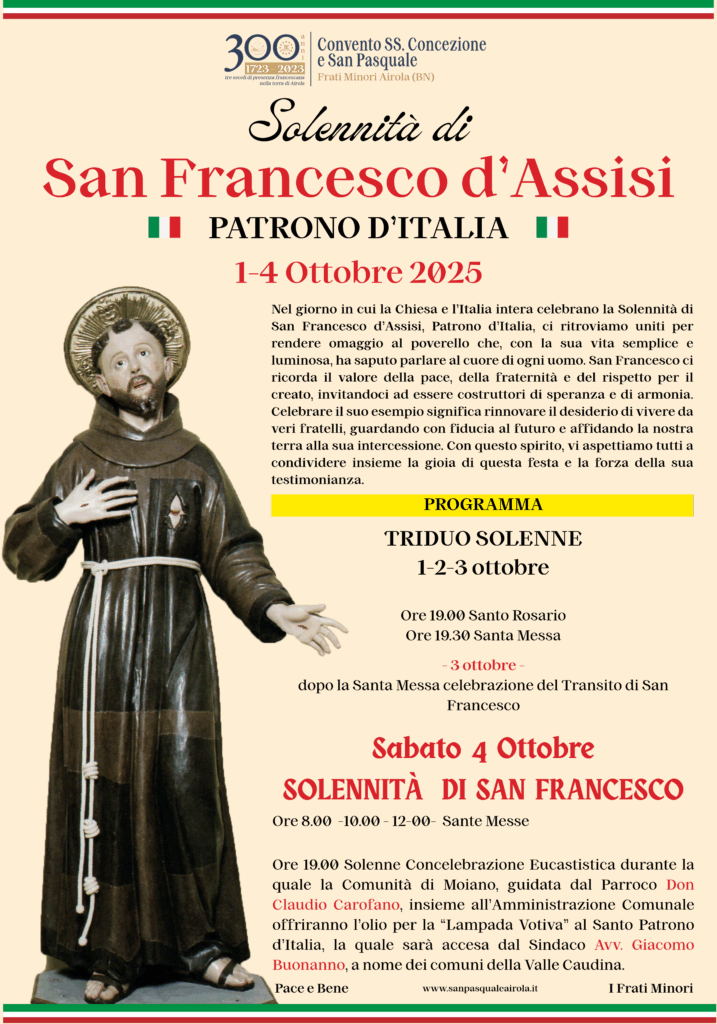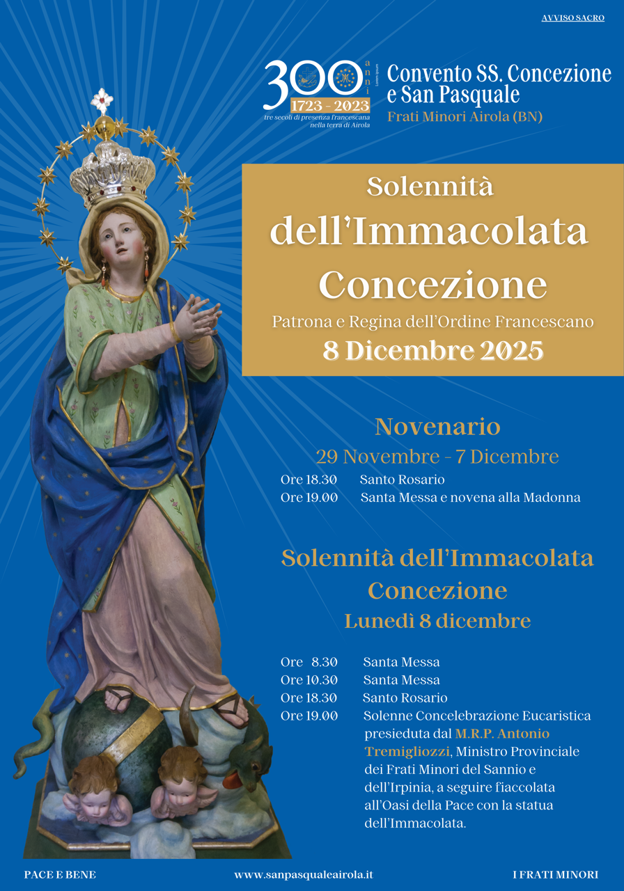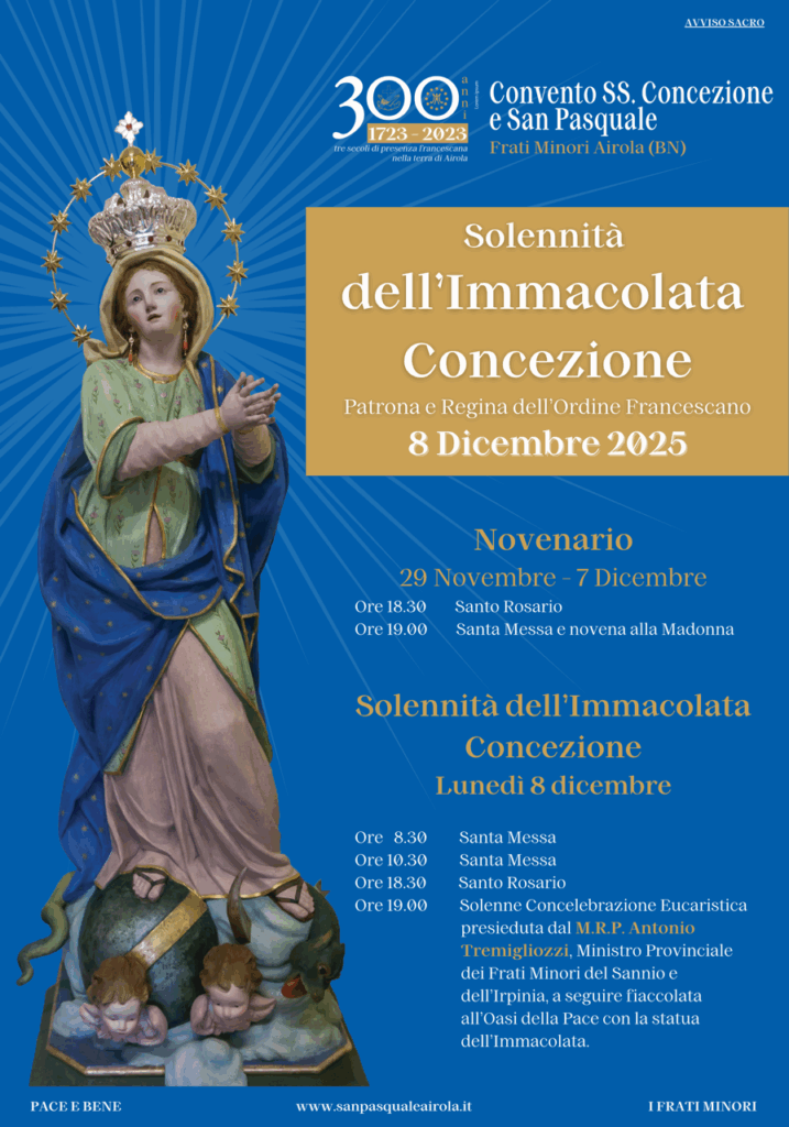 La Solennità dell’Immacolata Concezione ci invita a contemplare il mistero della grazia preveniente, quella luce che in Maria si fa principio di una nuova umanità. Ella, preservata dal peccato fin dal primo istante, diventa icona della Chiesa chiamata a lasciarsi purificare e guidare dallo Spirito. Nel nostro convento le celebrazioni di questi giorni vogliono condurci a riscoprire la bellezza di questo mistero: Maria Immacolata, Patrona e Regina dell’Ordine Francescano, è il segno della totale disponibilità al progetto di Dio, la donna che accoglie il Verbo e lo dona al mondo. Accostarsi a lei significa ritrovare lo sguardo limpido della fede, la docilità del cuore e la gioia di camminare nel Vangelo. Che la sua purezza illumini il nostro cammino e renda fecondi i gesti di fraternità, preghiera e servizio che vivremo in questa solennità.